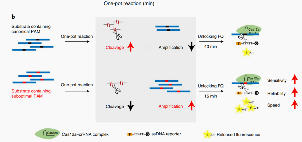 而次优PAM则会使Cas酶对靶标的识别减慢,从而减缓对靶标的切割反应,使反应向扩增反应的方向进行,从而使在更低浓度下也能被检测出来。